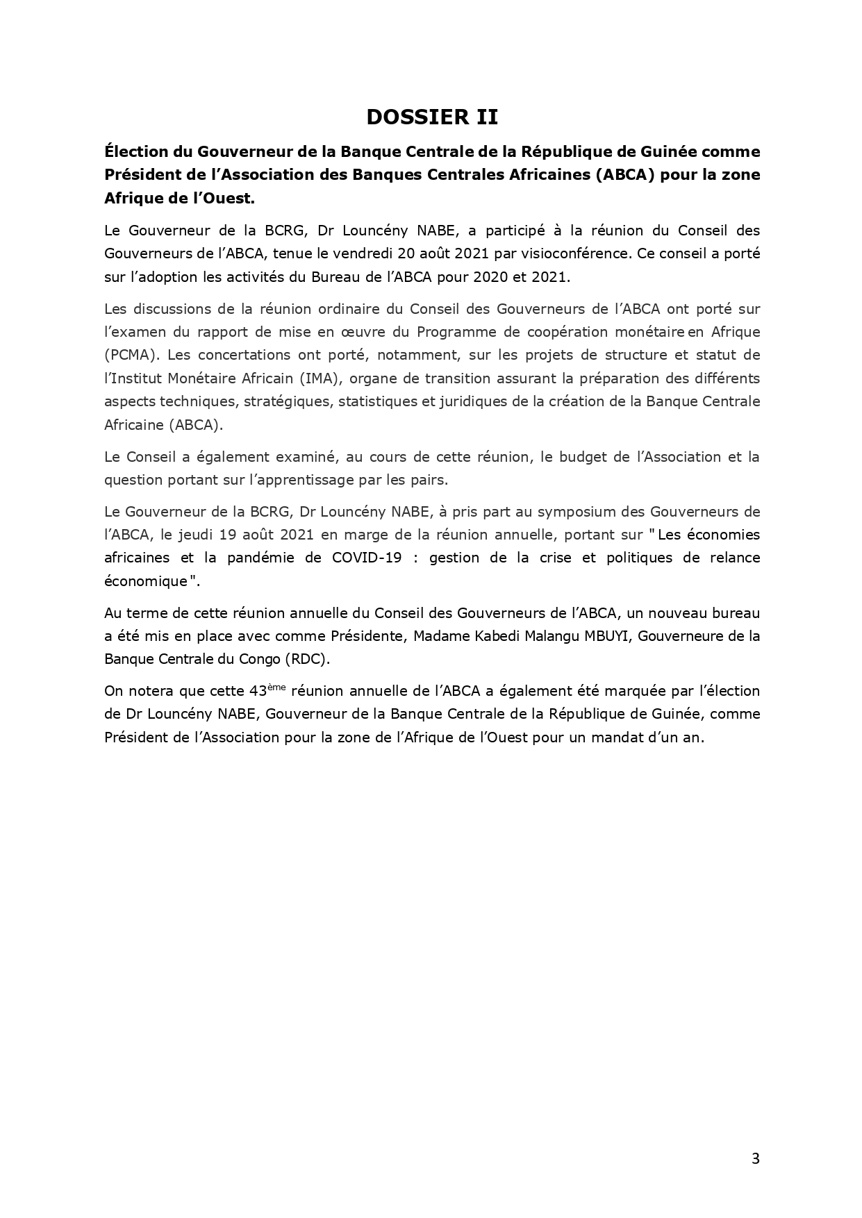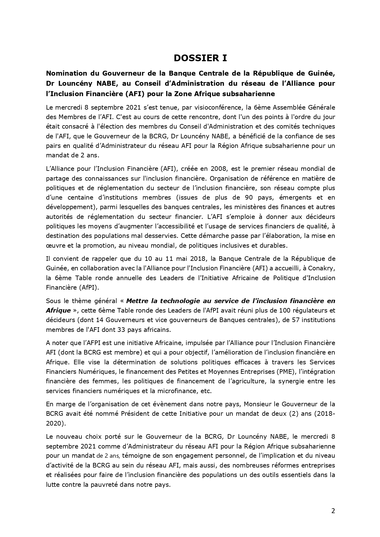 Le gouverneur de la Banque centrale de la République de Guinée ( BCRG), Dr. Lounceny Nabe entre au conseil d’administration du réseau de l’alliance pour inclusion financière (AFI) en sa qualité d’administrateur du réseau AFI pour la région Africaine subsaharienne pour un mandat de 2 ans. C’était le mercredi, 8 septembre dernier lors de la 6ème assemblée générale des membres de l’AFI tenue par une visioconférence. Et il a été également élu président de l’association pour la zone de l’Afrique de l’Ouest pour un mandat d’un an lors de la 43ème réunion annuelle de l’association des banques centrales Africaines( ABCA) pour la zone Afrique de l’ouest qui s’est tenue en fin août dernier par visioconférence.
