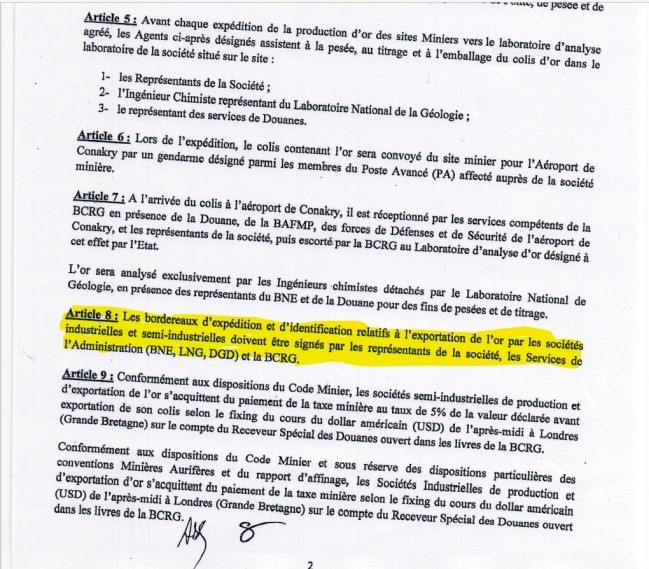 Détail important, l’arrêté conjoint exige que les bordereaux d’expédition et d’identification relatifs à l’exportation de l’or par les sociétés industrielles et semi-industrielles doivent être « signés par les représentants de la société, les services de l’administration (BNE, LNG, DGD) et la BCRG ».