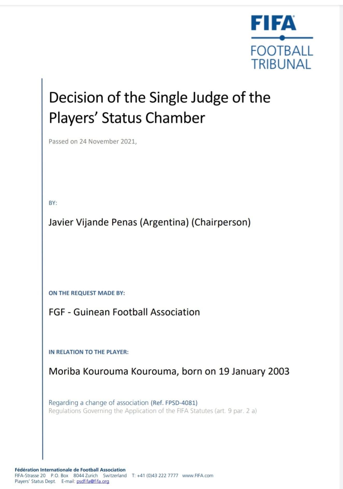 ZURICH- officiellement, Moriba Illaix Kourouma peut à partir d’aujourd’hui défendre les couleurs du Syli National de Guinée. Dans une correspondance adressée ce mercredi à la fédération guinéenne de Football, la FIFA confirme que le jeune guinéen de 18 ans est désormais autorisé à jouer avec la Guinée.