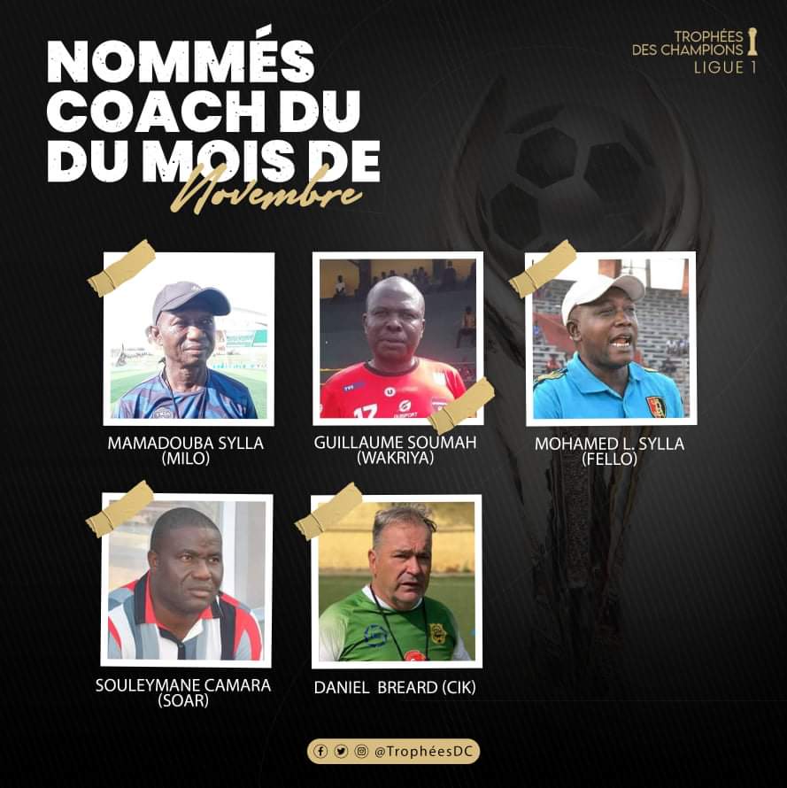 Chez les entraineurs on retrouve, Mamadouba Sylla « Gaucher » du Milo FC avec 4 victoires plus une défaite après 5 journées de championnat, Mohamed Lamine Sylla « Leandro » du Fello Star avec 3 victoires et 2 défaites, Souleymane Camara « Abédi » qui totalise 3 succès, une défaite et un match nul avec l’Académie SOAR, Daniel Breard du CIK qui a fait 3 victoires et 2 nuls avec le Club du Bagataye et Guillaume Soumah coach du Wakriya AC qui totalise également trois victoires et deux nuls après 5 matchs.