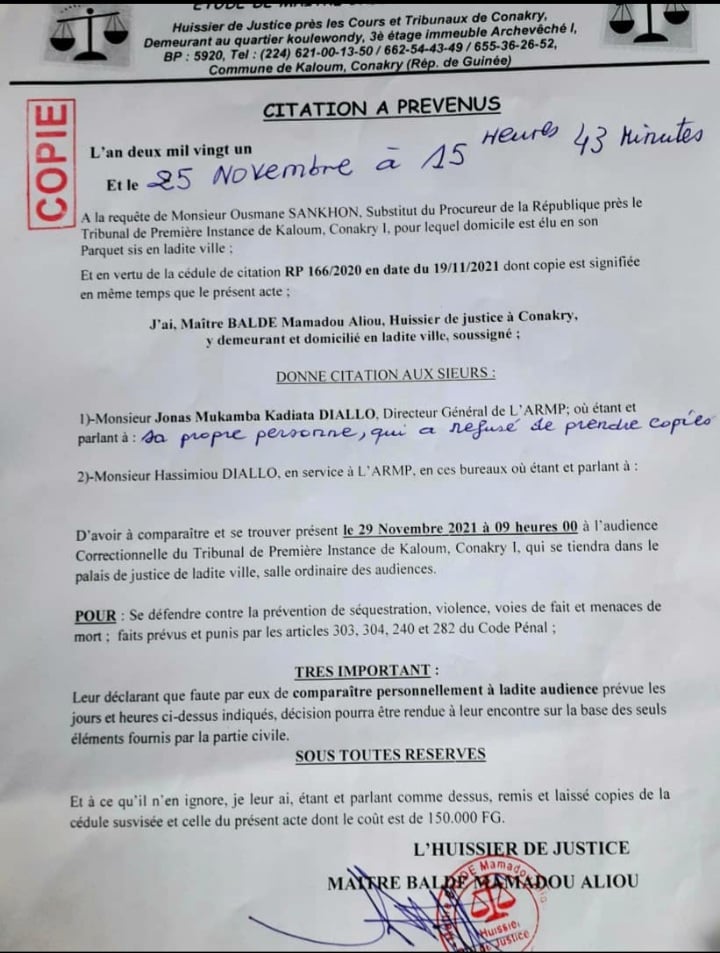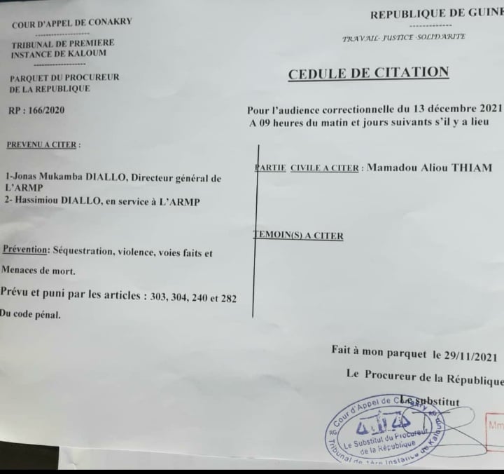 C’est ainsi, qu’une cédule de citation a été délivrée contre eux par le tribunal de première instance de Kaloum le 19 novembre dernier. Dans la citation, le substitut du tribunal de Kaloum a demandé à Jonas Mukamba Kadiata Diallo et Hassimiou Diallo de se présenter à l’audience correctionnelle du 29 novembre à 9 heures.
