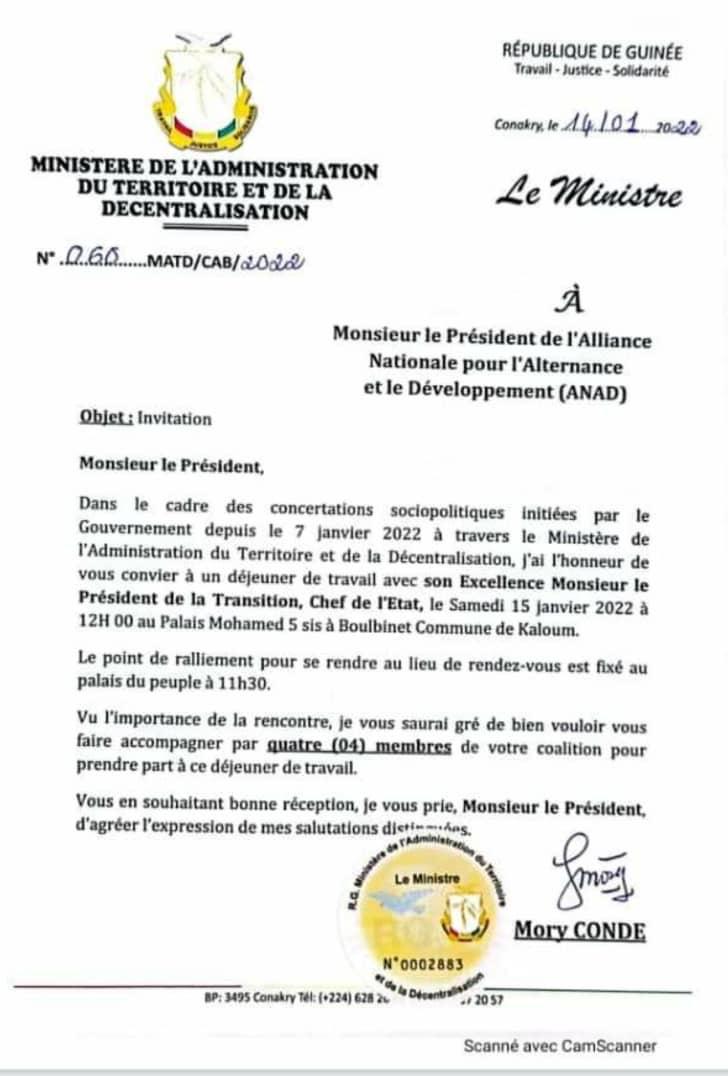 Les nombreuses coalitions politiques dont la CORED, l’ANAD et le FNDC politique ont toutes reçu leurs invitations signées du ministre de l’Administration du territoire et de la décentralisation Mory Condé.