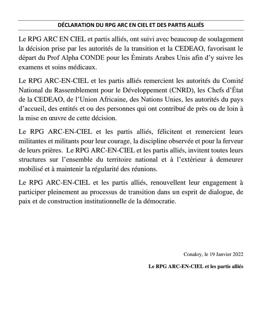 Le RPG ARC-EN-CIEL et les partis alliés remercient les autorités du Comité National du Rassemblement pour le Développement (CNRD), les Chefs d’État de la CEDEAO, de l’Union Africaine, des Nations Unies, les autorités du pays d’accueil, des entités et ou des personnes qui ont contribué de près ou de loin à la mise en œuvre de cette décision. Le RPG ARC-EN-CIEL et les partis alliés, félicitent et remercient leurs militantes et militants pour leur courage, la discipline observée et pour la ferveur de leurs prières. Le RPG ARC-EN-CIEL et les partis alliés, invitent toutes leurs structures sur l’ensemble du territoire national et à l’extérieur à demeurer mobilisées et à maintenir la régularité des réunions.Le RPG ARC-EN-CIEL et les partis alliés renouvellent leur engagement à participer pleinement au processus de transition dans un esprit de dialogue, de paix et de construction institutionnelle de la démocratie. Conakry, le 19 Janvier 2022 Le RPG ARC-EN-CIEL et les partis alliés »