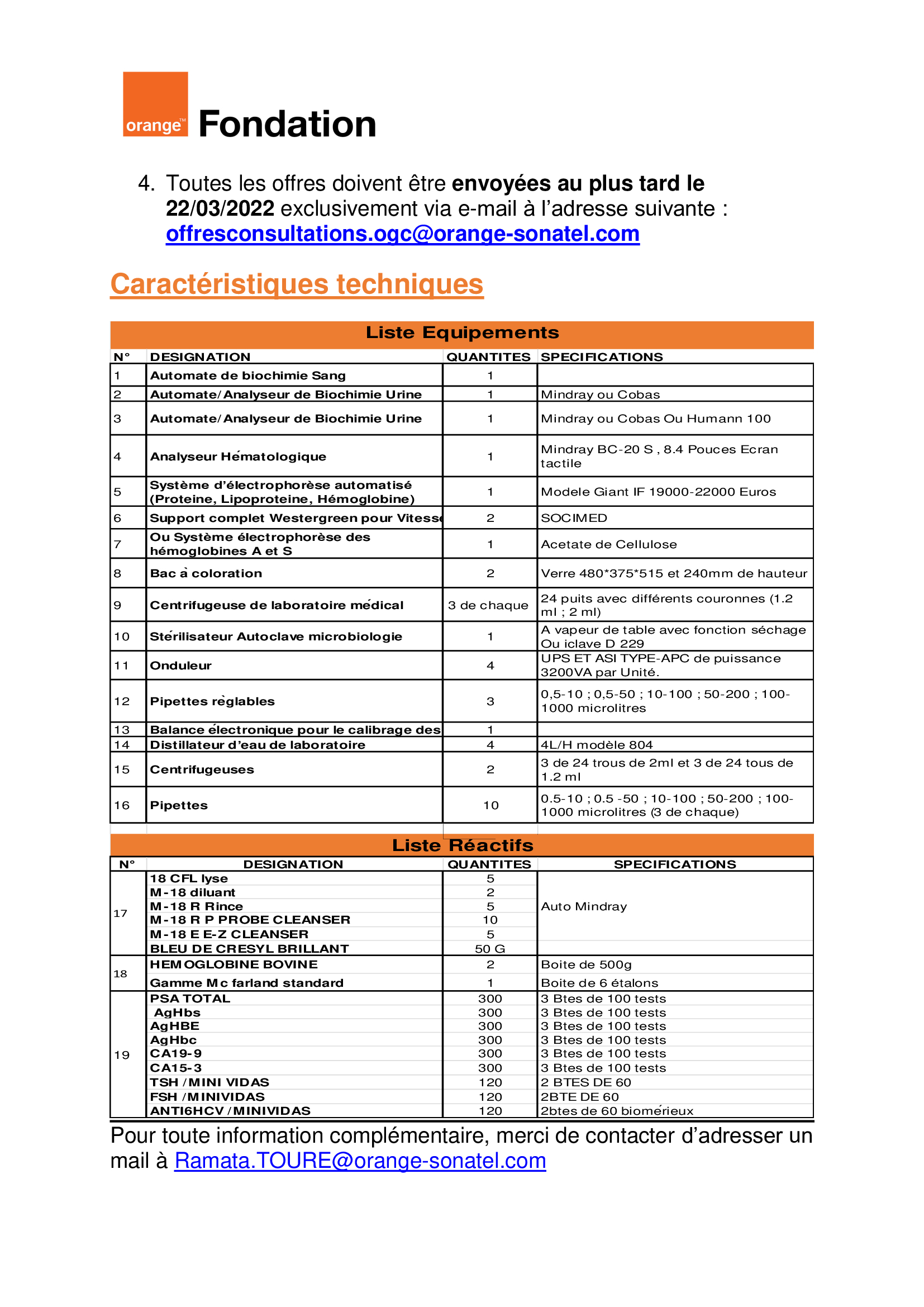 Toutes les offres doivent être envoyées au plus tard le 22/03/2022 exclusivement via e-mail à l’adresse suivante : offresconsultations.ogc@orange-sonatel.com.