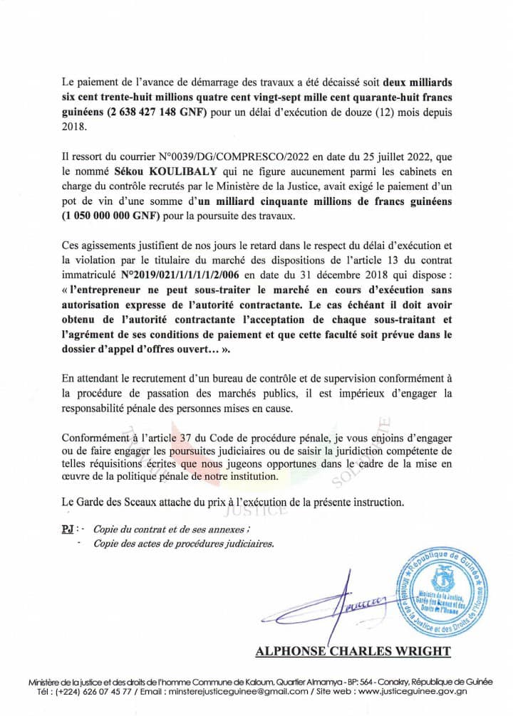 Une lettre a été adressée au procureur général près la cour d’appel de Conakry, par le ministre de la Justice, Alphonse Charles Wright.