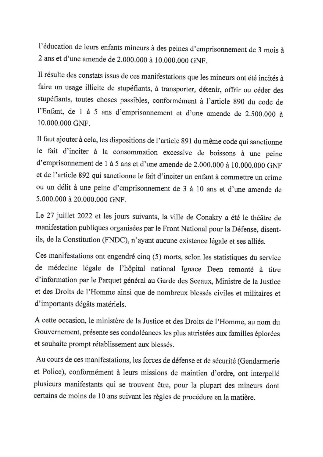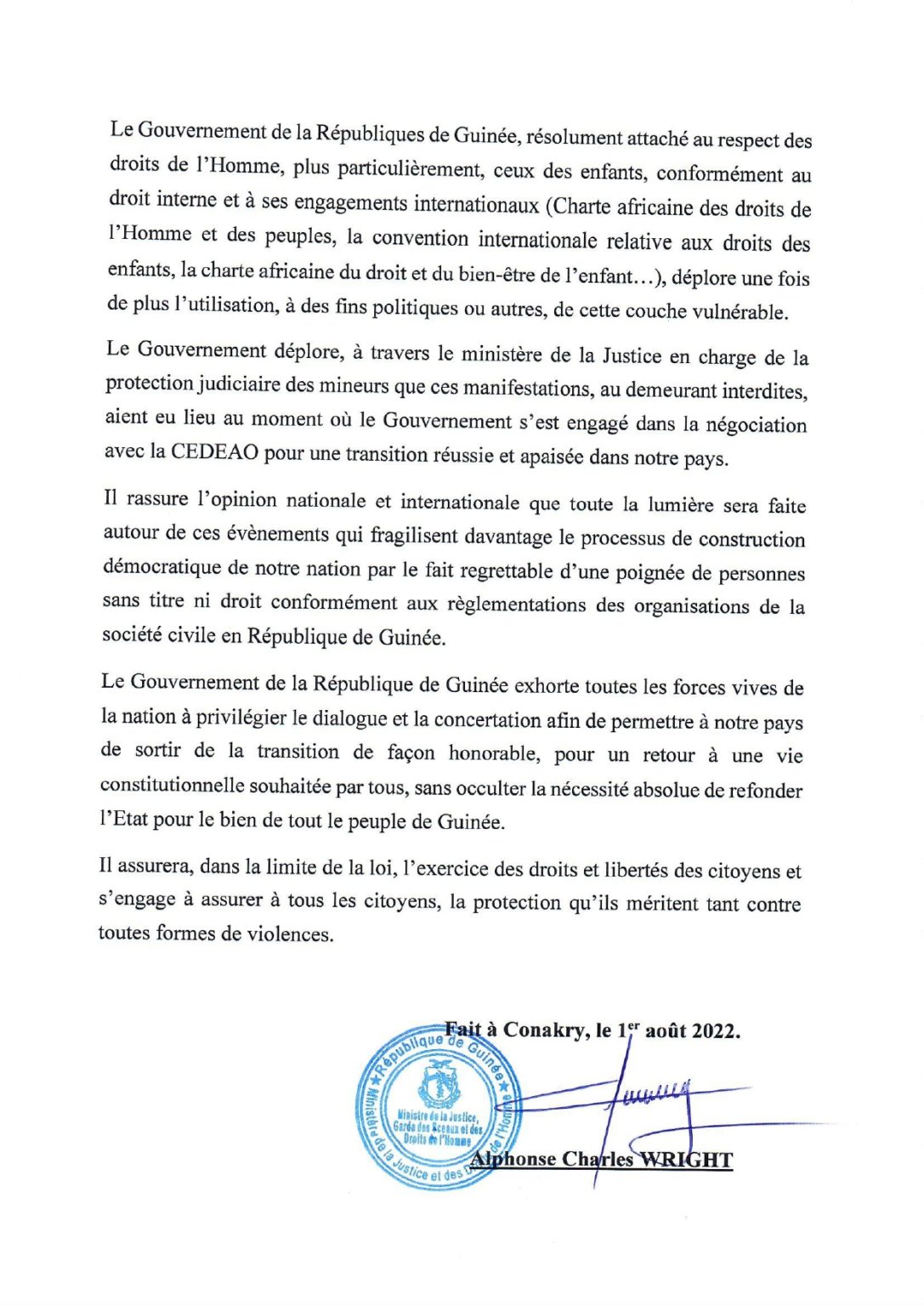 Alphonse Charles Wright, ministre de la Justice, parlant des récentes manifestations appelées par le FNDC, a déclaré que « toute la lumière sera faite autour de ces évènements qui fragilisent davantage le processus de construction démocratique de notre nation par le fait regrettable d’une poignée de personnes sans titre ni droit conformément aux règlementations des organisations de la société civile en République de Guinée ». Lire ci-dessous toute la déclaration.