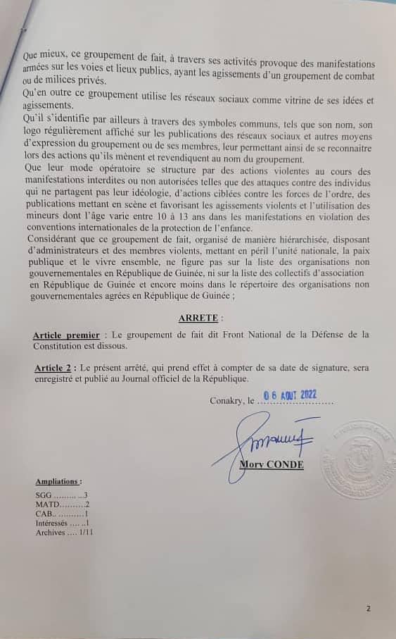 Dans un arrêté en date du 6 août, le ministère de l’Administration du territoire a dissous le FNDC. Lire ci-dessous l’arrêté.