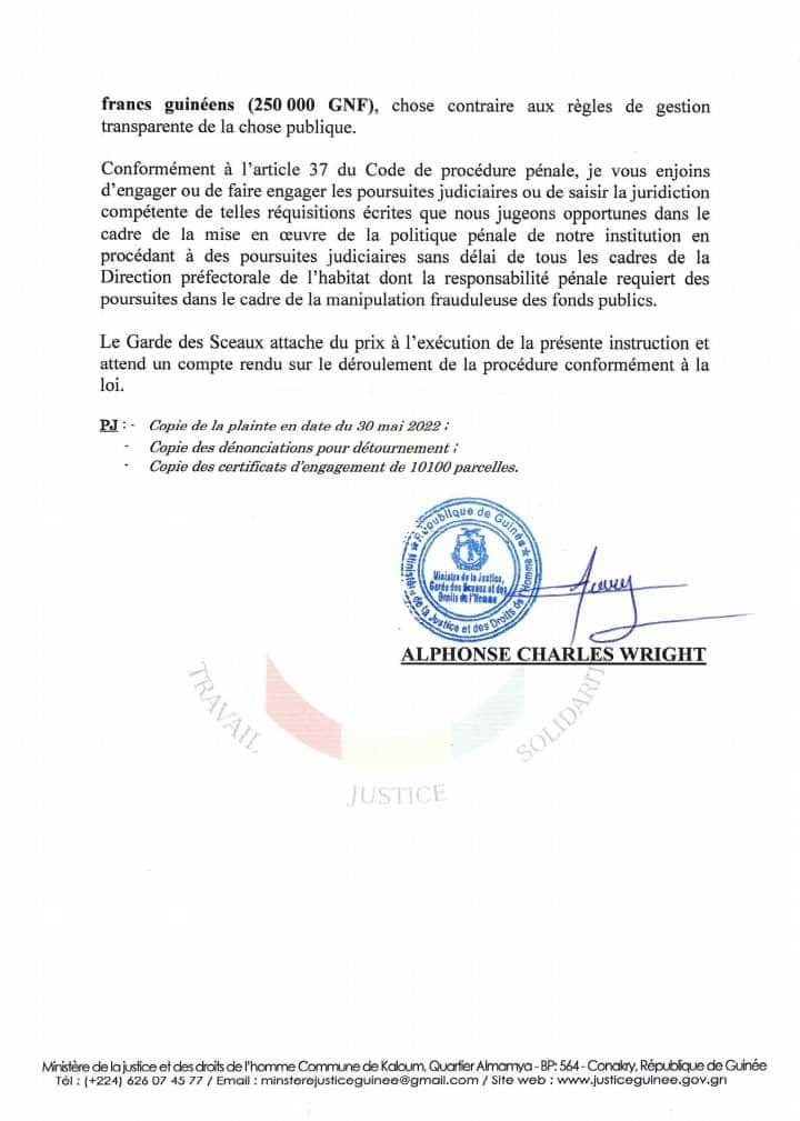 Pour des faits présumés, de détournements de biens publics, enrichissement d’agents publics et complicité, le ministre de la justice et des droits de l’homme, Alphonse Charles Wright, a ordonné au procureur de la cour d’appel de Conakry, de poursuivre Ousmane Lansary Sylla, directeur préfectoral de l’habitat de Coyah dénoncé par un collectif de jeunes. Lire ci-dessous sa lettre.