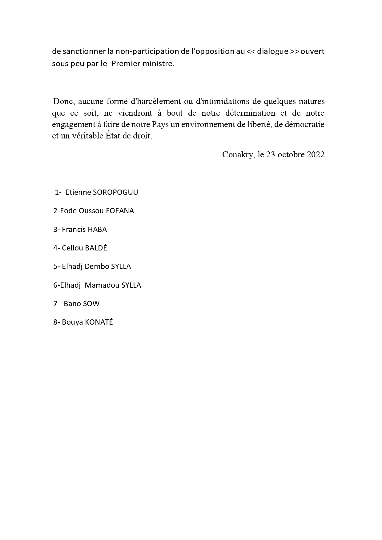 Des responsables politiques guinéens, au nombre de huit, ont cosigné une déclaration dans laquelle ils annoncent qu’ils répondront ce lundi à la convocation de la direction centrale des investigations judiciaires de la gendarmerie (DCIJ-GN) en compagnie de leurs avocats. Car, décident-ils, « nous préférons être lâchement détenus par un régime répressif que d’être nos propres prisonniers ». Déclaration