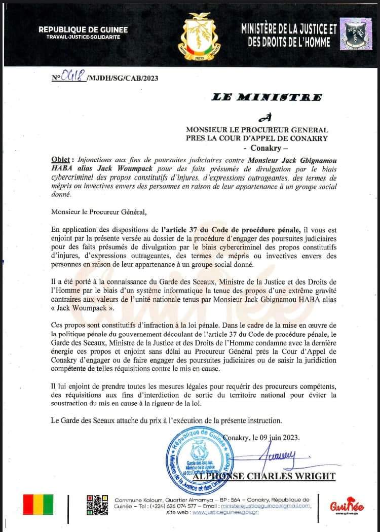 L’article « Injures et mépris envers un groupe social » : le ministre Wright instruit des poursuites contre l’artiste Jack Woumpack est apparu en premier sur Mediaguinee.com.