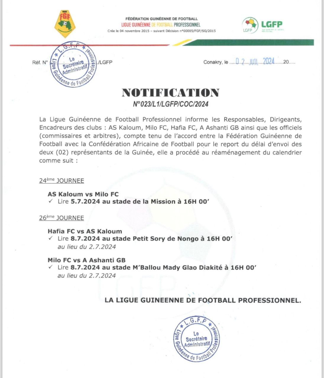 CONAKRY- La Ligue Guinéenne de Football Professionnel vient d’annoncer des décisions suites aux incidents survenus au stade de la mission Kaloum lors du match de la 24e journée entre ASK et Milo.