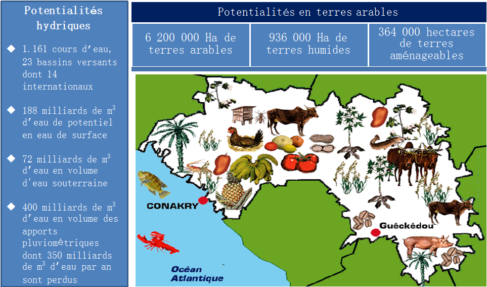 La Guinée est un pays qui regorge de ressources naturelles lui conférant un potentiel de croissance suffisant pour émerger de la pauvreté. Ces ressources naturelles constituent un élément déterminant dans la mise en valeur des importantes opportunités de compétitivité du secteur agricole. Leur préservation exige, de la part des investisseurs, d’orienter l’agriculture sur des sentiers plus durables et moins prédateurs de ces ressources. Parmi ces ressources, on dénombre 6,2 millions de terres arables dont seuls 1,6 millions d’hectares sont actuellement exploités grâce en grande partie, aux investissements importants consentis par l’Etat dans l’aménagement des infrastructures rurales.